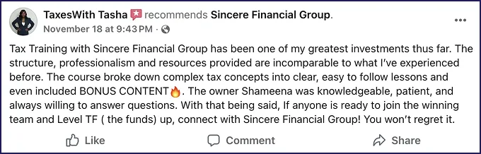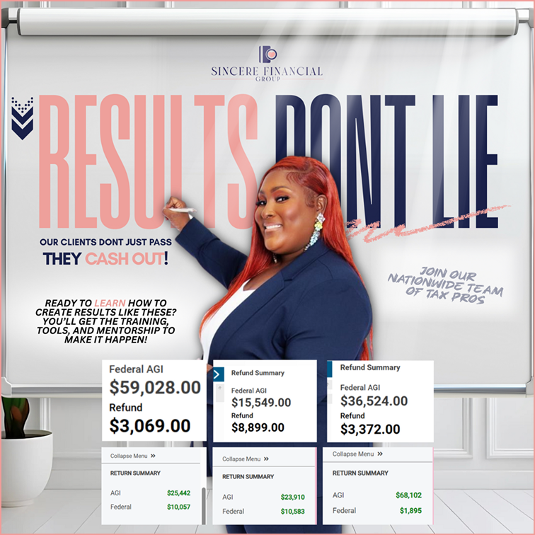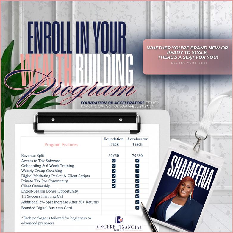 Shameena built her tax career from the ground up — mastering the industry, launching her own firm, and training everyday people to earn real income. She’s helped people earn hundreds per return, understand tax preparation step-by-step, and build confidence in a field they never imagined entering.
